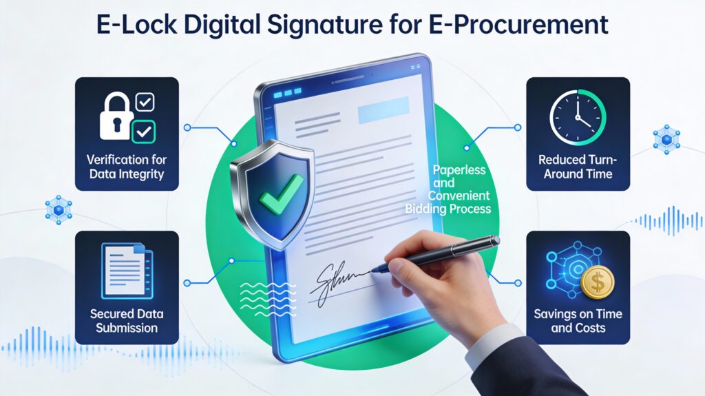 The seamless integration of E-Lock solutions with existing e-procurement applications offers the necessary security, authentication, confidentiality and non-repudiation to the transacted data. In a typical e-procurement process, it is critical to have data authentication and verification to preserve accuracy and accountability. Once the submitted data is signed digitally it becomes legitimate, facilitating security and convenience. The entire data is sent in an encrypted format, and the decryption and verification process takes place at the server level. Later, it goes for further processing.