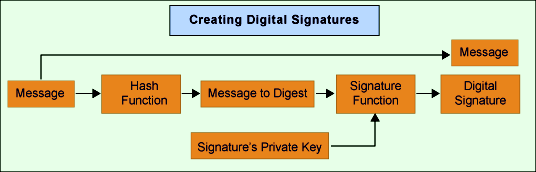 Digital Signature Signing. During the signing, once the user initiates the process, a mathematical code is generated with the help of an algorithm and, the digital contents. The code generated, known as the 'message digest', is unique for each process and content. The individual's private key is now used to encrypt this code. This is termed as the 'Digital Signature'. Since the private key of a person is involved, the 'Digital Signature' is unique to that individual. This establishes the identity of the signer. This signature is then bound to the message and sent along with the document or the transaction. The public key of the individual is also sent..