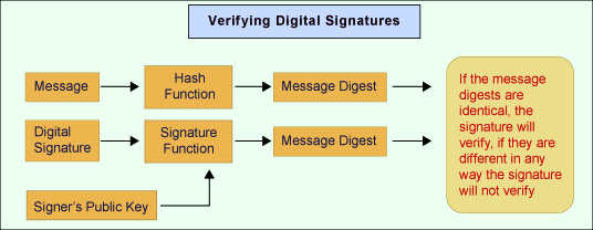 When an individual receives a signed document or transaction, he will initiate the verification process. The public key of the sender is used to decrypt the digital signature and retrieve the message digest. The hash algorithm is applied again to the digital contents to generate another message digest. These two message digests are compared and if they match verification is successful. If there were any changes in the digital contents the resultant message digest would differ from the original one and the verification would fail.